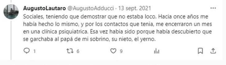 "Hacía once años me había hecho lo mismo y por los contactos que tenía, me encerraron un mes en una clínica psiquiátrica. Esa vez había sido porque había descubierto que se garchado al papá de mi sobrino, su nieto, el yerno", confesó Augusto.