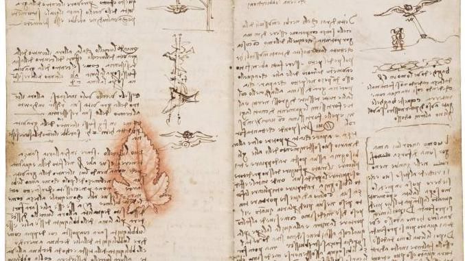 En esta obra, el inventor habla de la resistencia de los pájaros al aire, su anatomía o de las plumas, una información que le valió para "reflexionar sobre una primera idea de una máquina volante", dijo la curadora de la exposición, Sara Taglialagamba.