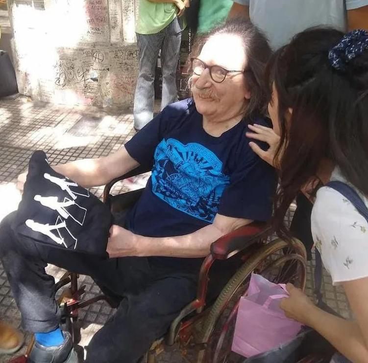 En silla de ruedas, el Bicolor se encontraba de muy buen humor y vistiendo una remera con la tapa de un disco de Pappo's Blues.