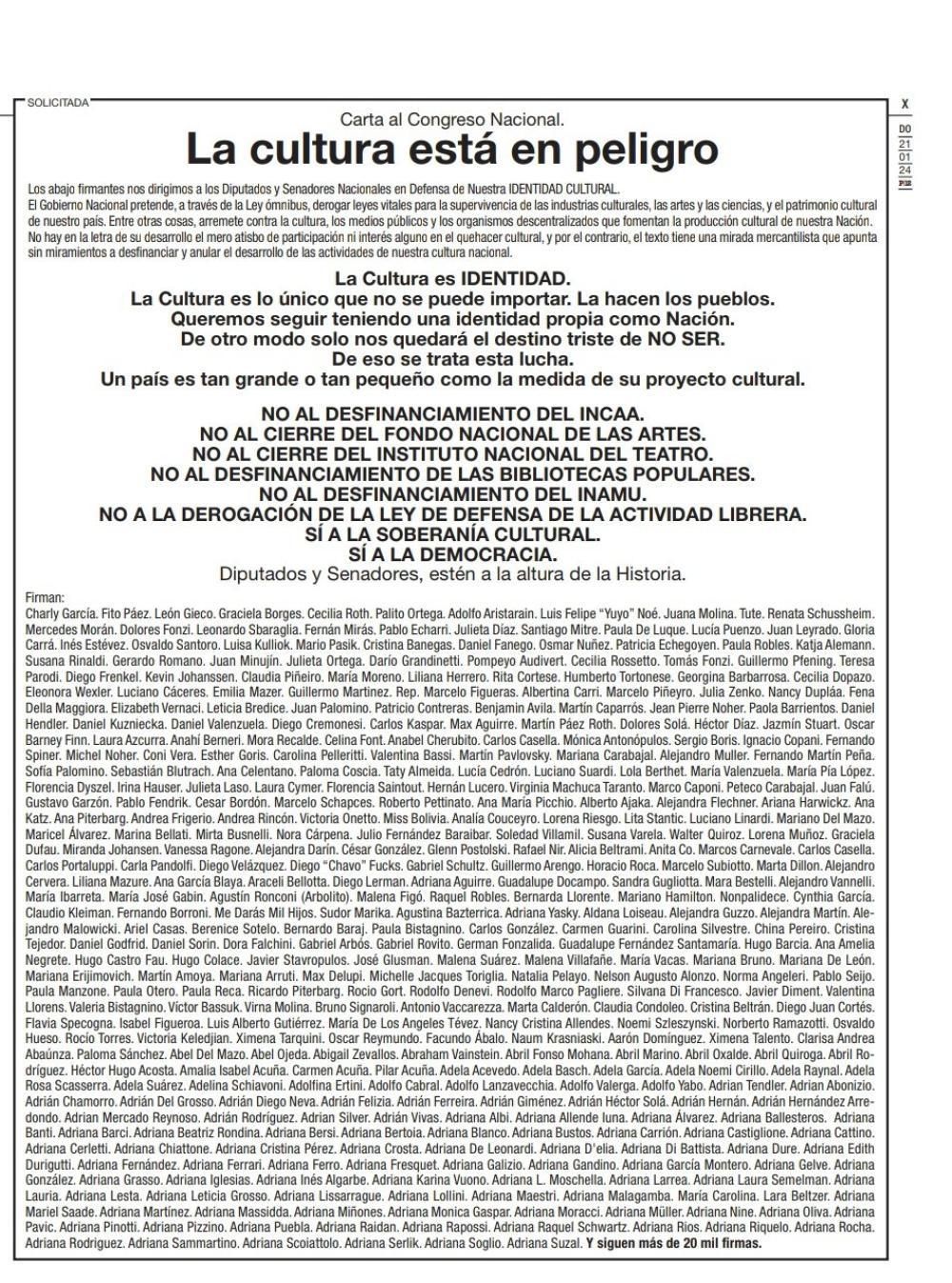En rechazo al DNU y la Ley Ómnibus del presidente Javier Milei, la solicitada cuenta con un apoyo masivo de referentes de la cultura nacional de todos los sectores.