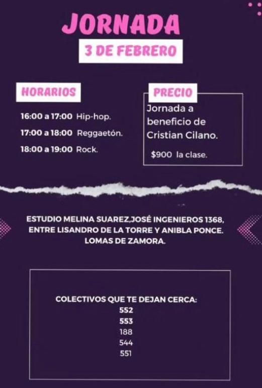 Organizar este encuentro surge a través de una de las profes del estudio de danzas de Budge que contó que su papá Cristián Cilano estaba necesitando las prótesis de rodillas que tienen un costo de $3 millones cada una de ellas y sin ese material no puede operarse.