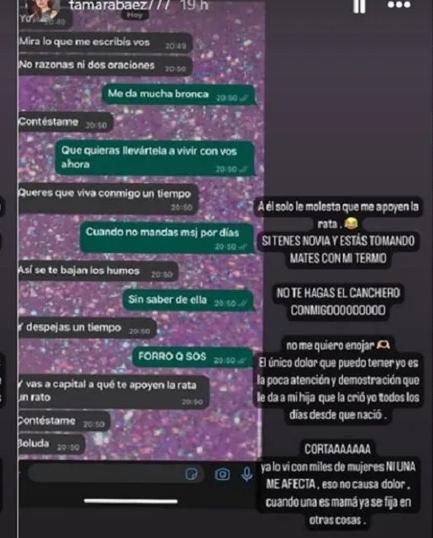 "Mirá lo que me escribís vos. No razonas ni dos oraciones", le escribió Elián. A lo que Tamara le contestó: "Me da mucha bronca, que quieras llevártela a vivir con vos ahora, cuando no mandas mensaje por días sin saber de ella. Forro que sos".