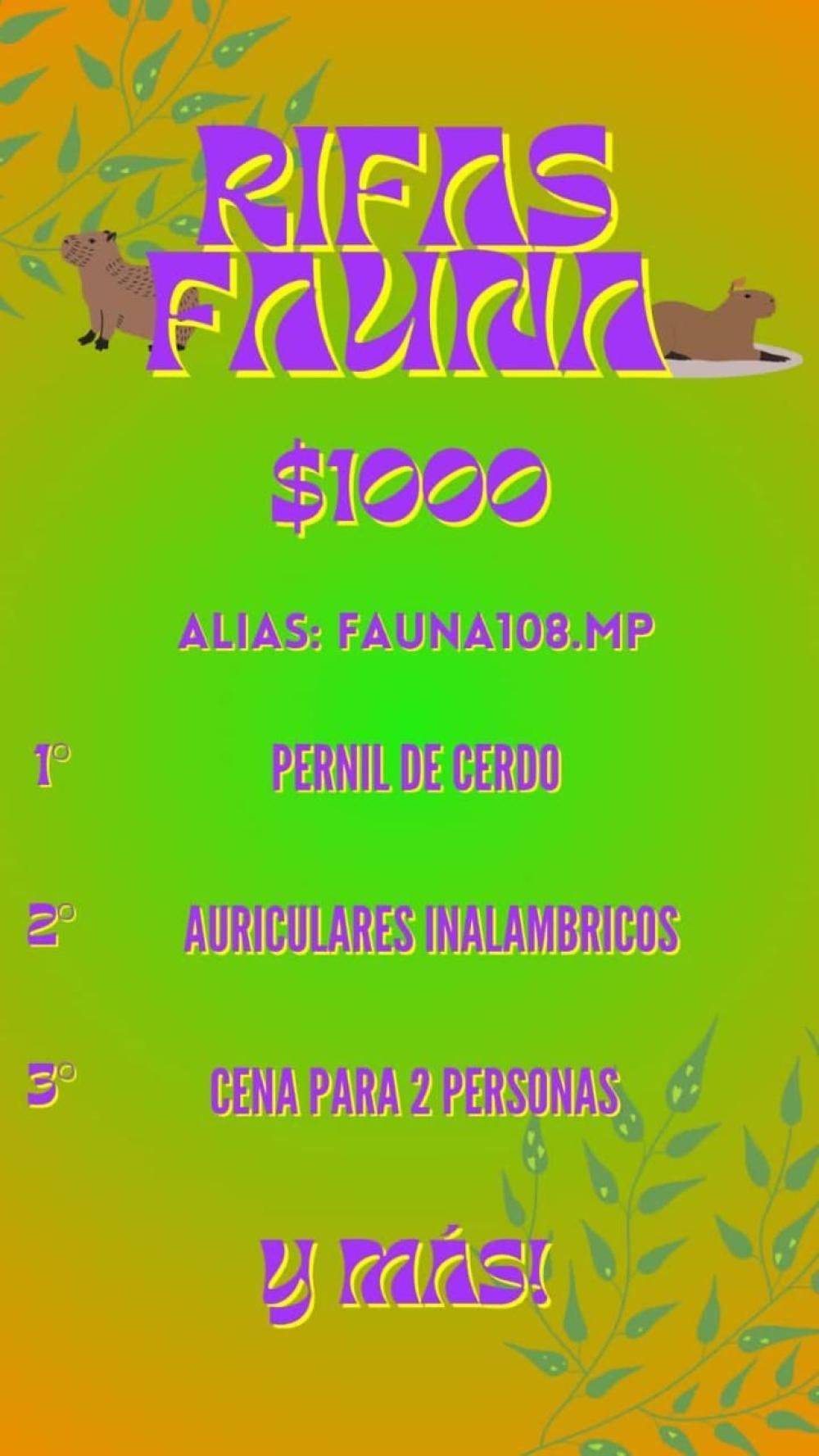 Cada número (200 en total) de la rifa cuesta $1 mil y tiene como premio un pernil de cerdo, unos auriculares inalámbricos y una cena para dos personas. El sorteo se hará en vivo el próximo sábado 10 de febrero, cuando Fauna Centro Cultural realice el "Festi Fauna", un evento que comenzará a las 18 y que contará con música en vivo (con la presencia de Tinto Martín, Bet Posmo, el Roki SKI y la Periferia Conurbana, sumado al dj Latin Mami), feria de emprendedores y hasta radio.