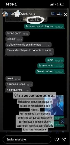 Asimismo, en lo que fue la parte más polémica de su descargo, publicó el chat de la última conversación que habían tenido previo al ingreso a la casa de Gran Hermano. "Bueno, gordo. Te amo. Cuidate y confiá en mí siempre. Y no andas chapando por ahí con nadie#, le decía ella. "jajaj te amo, tonta. Te va a ir re bien", le expresó él. "Lo sé. Saludos a todos. Y bánquenme", le pidió ella.