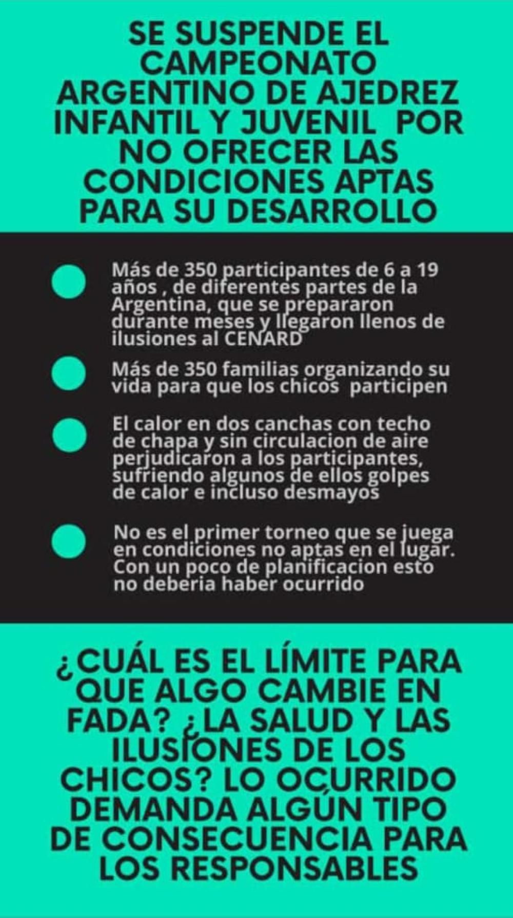 Según consta en un comunicado redactado por los padres de los jóvenes ajedrecistas "varios niños sufrieron estrés térmico y se descompensaron necesitando atención médica básica de urgencia debido a las altas temperaturas existentes el ambiente donde se desarrollaba el juego. Estos canchones (de pelota paleta) que tienen techo de chapa, una sola puerta de acceso de aire y ventanales altos que estaban anulados /cerrados por donde nunca pudo ventilarse el espacio, albergaron a más de 300 niños".