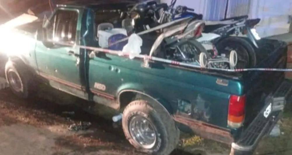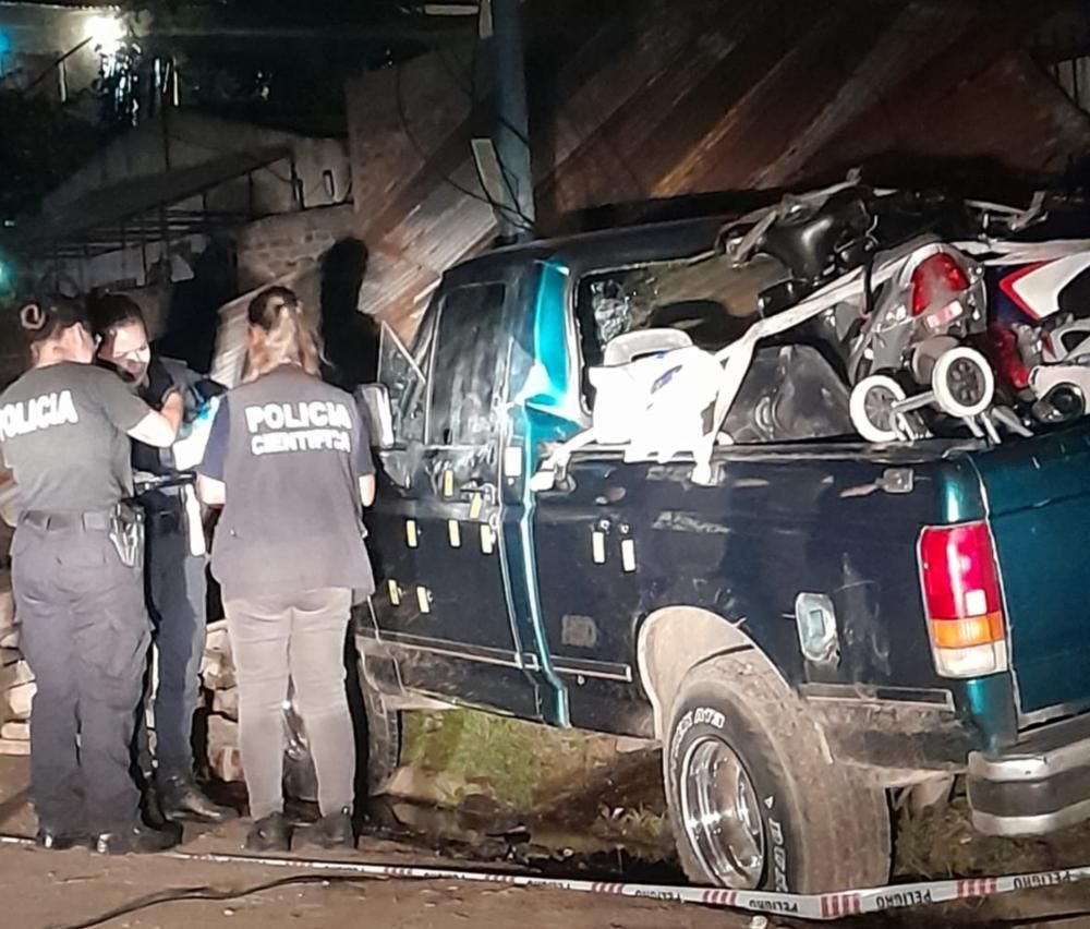 La camioneta quedó con el capot levantado por el impacto, con el parabrisas dañado y arriba de la caja llevaba dos motocicletas que acababa de cargar porque tenía planeado salir pocos minutos después de vacaciones.