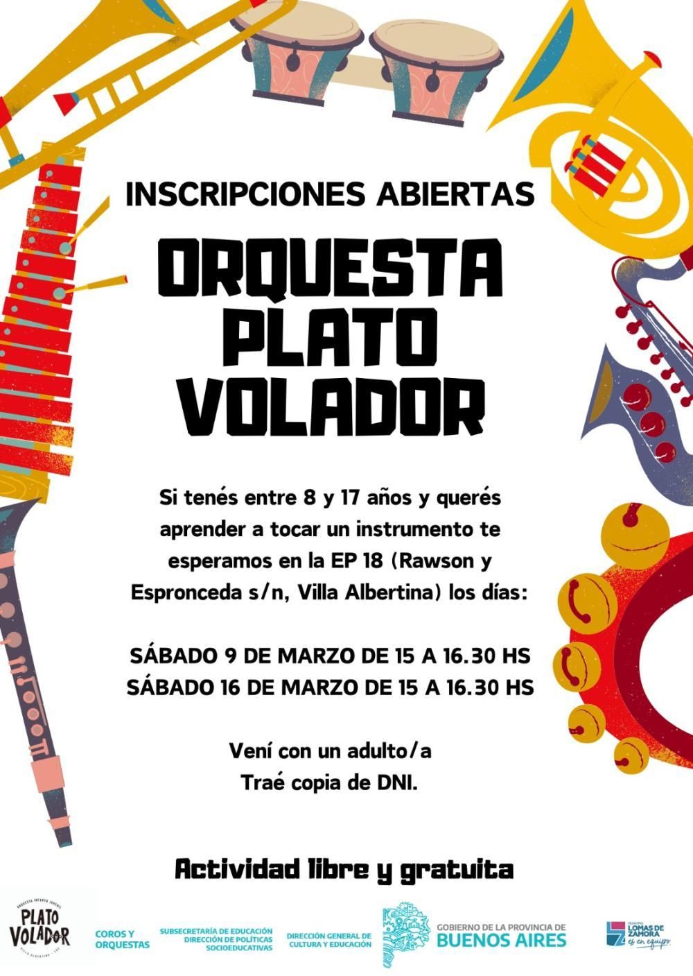 La Orquesta Plato Volador, que viene de celebrar su primera década de vida trabajando por el acceso al arte y la cultura de los chicos de Lomas de Zamora, abre su inscripción para alumnos de entre 8 y 17 años que quieran tocar un instrumento.