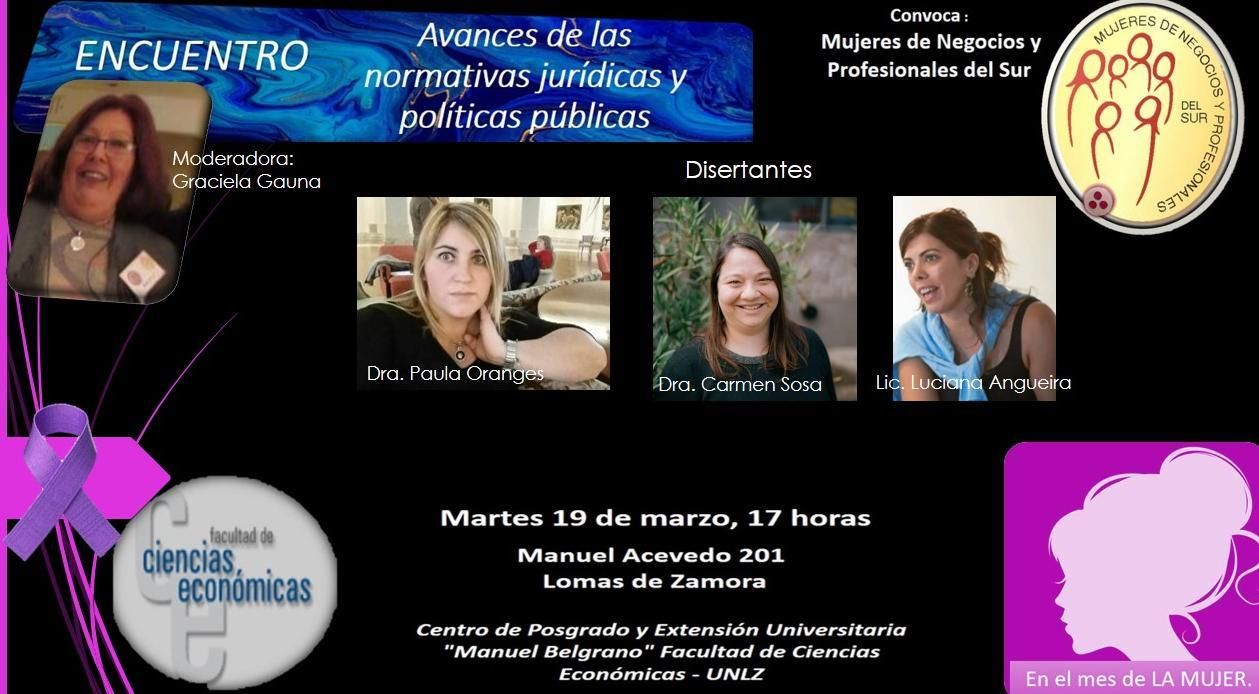 Para conmemorar el Día de la Mujer, la Asociación de Mujeres de Negocios y Profesionales del Sur de Lomas convoca a un encuentro gratuito sobre los avances de las normativas jurídicas y políticas públicas en el Centro de Posgrado y Extensión Universitaria de la Facultad de Ciencias Económicas de la Universidad Nacional de Lomas de Zamora, ubicado en Acevedo 201, esquina Sáenz.