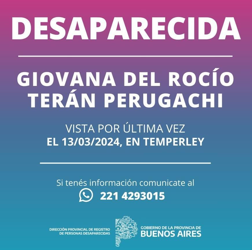 Por cualquier información que permita ubicar a Giovana, comunicarse con el 911 o llamar al 0221-429-3015. También se puede aportar información enviando un correo electrónico a [email protected]