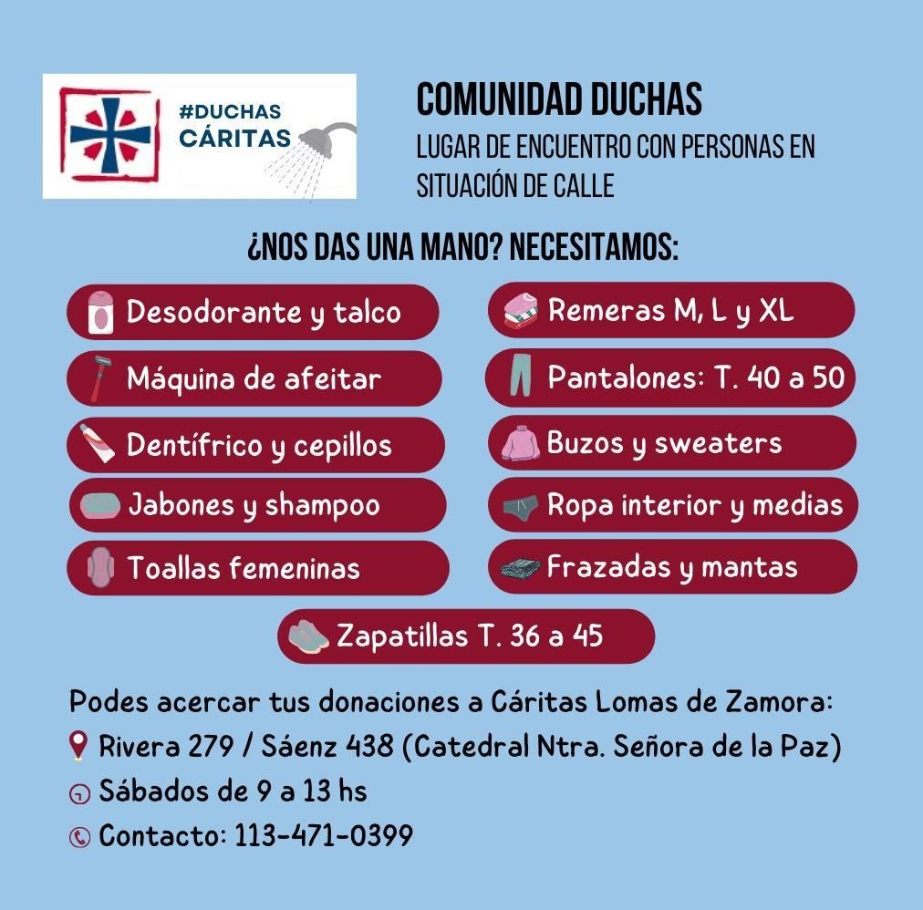 El espacio de Cáritas necesita donaciones para que las personas en situación de calle puedan seguir concurriendo al espacio lomense para higienizarse y cambiarse de ropa.