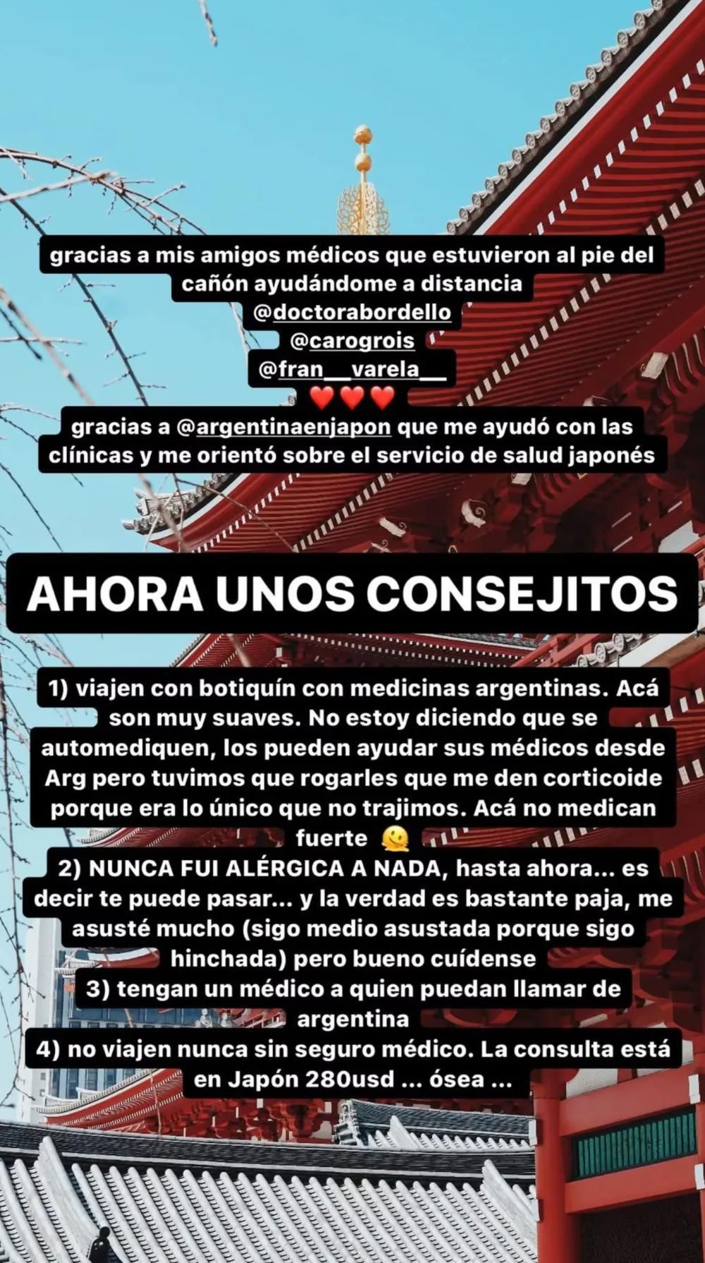 El segundo posteo, agregó: consejo que dio fue: "Nunca fui alérgica a nada, hasta ahora. Es decir, te puede pasar y la verdad es bastante paja, me asusté mucho". También agregó: "Tengan un médico a quien puedan llamar de Argentina".