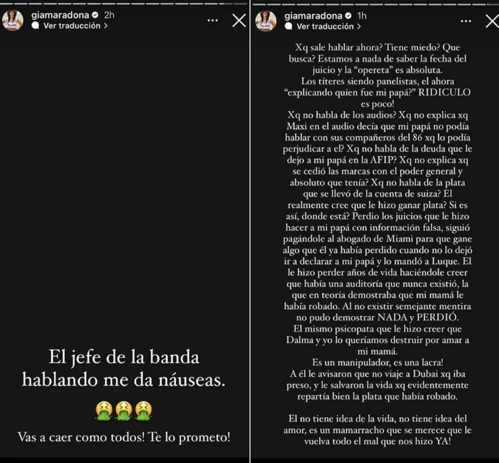 Gianinna Maradona no se quedó callada y respondió desde sus historias de Instagram: "El jefe de la banda hablando me da náuseas. Vas a caer como todos, te lo prometo".