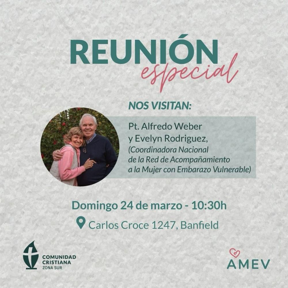 La Comunidad Cristiana Zona Sur realizará una reunión especial abierta a la comunidad, el próximo domingo (de 10 a 13), donde tendrán la visita del pastor Alfredo Weber y su esposa Evelyn Rodríguez, quienes hablarán sobre el trabajo que realiza la Red de Acompañamiento a la Mujer con Embarazo Vulnerable, un espacio que ayuda a madres que deben afrontar una maternidad inesperada. La charla se dará en el marco del culto de domingo que tiene semanalmente la Comunidad y pueden ser partícipes del encuentro cualquier vecino, sin importar el credo.