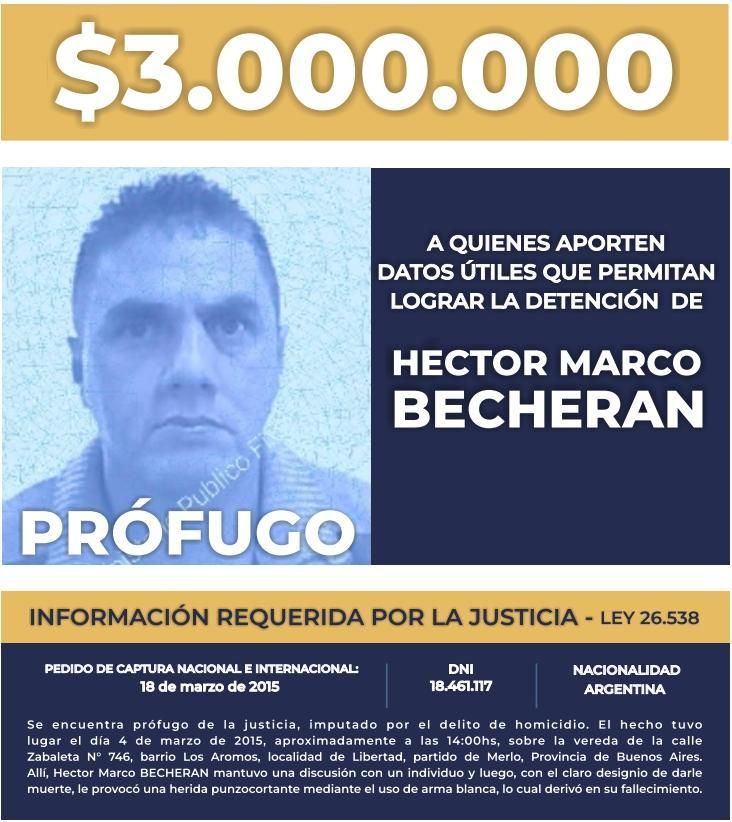Concretamente, se ofrece "dentro del territorio de la República Argentina, la suma de pesos tres millones ($3.000.000) destinada a aquellas personas que, sin haber intervenido en los hechos delictuales, brinden datos útiles que permitan lograr la detención" de Becheran.