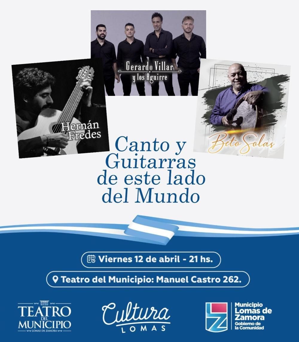 "Canto y Guitarras de este lado del Mundo", viernes a las 21 en el Teatro del Municipio de Lomas de Zamora, Manuel Castro 262. La entrada es gratuita.