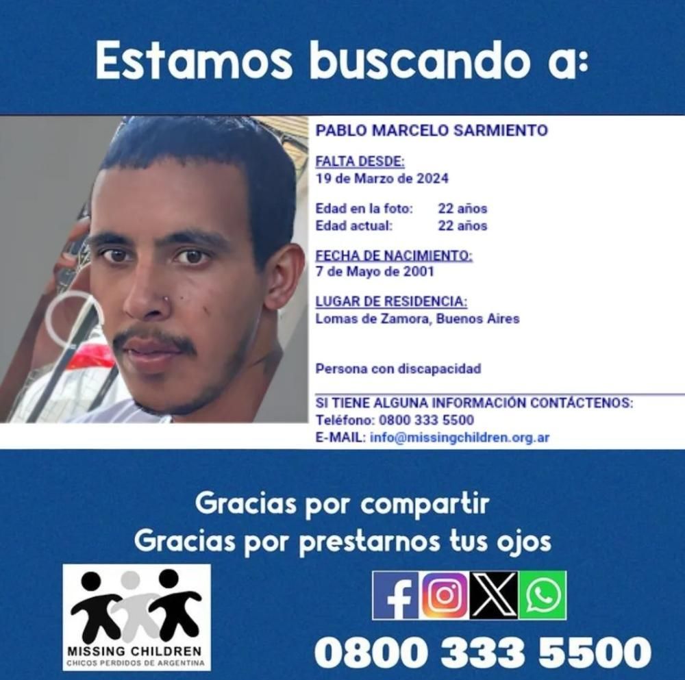 Pablo Marcelo Sarmiento tiene 22 años, vive en el barrio Villa Albertina de Lomas de Zamora y es intensamente buscado desde el mes pasado. La familia está desesperada porque el joven tiene retraso madurativo y no lleva consigo su medicación.