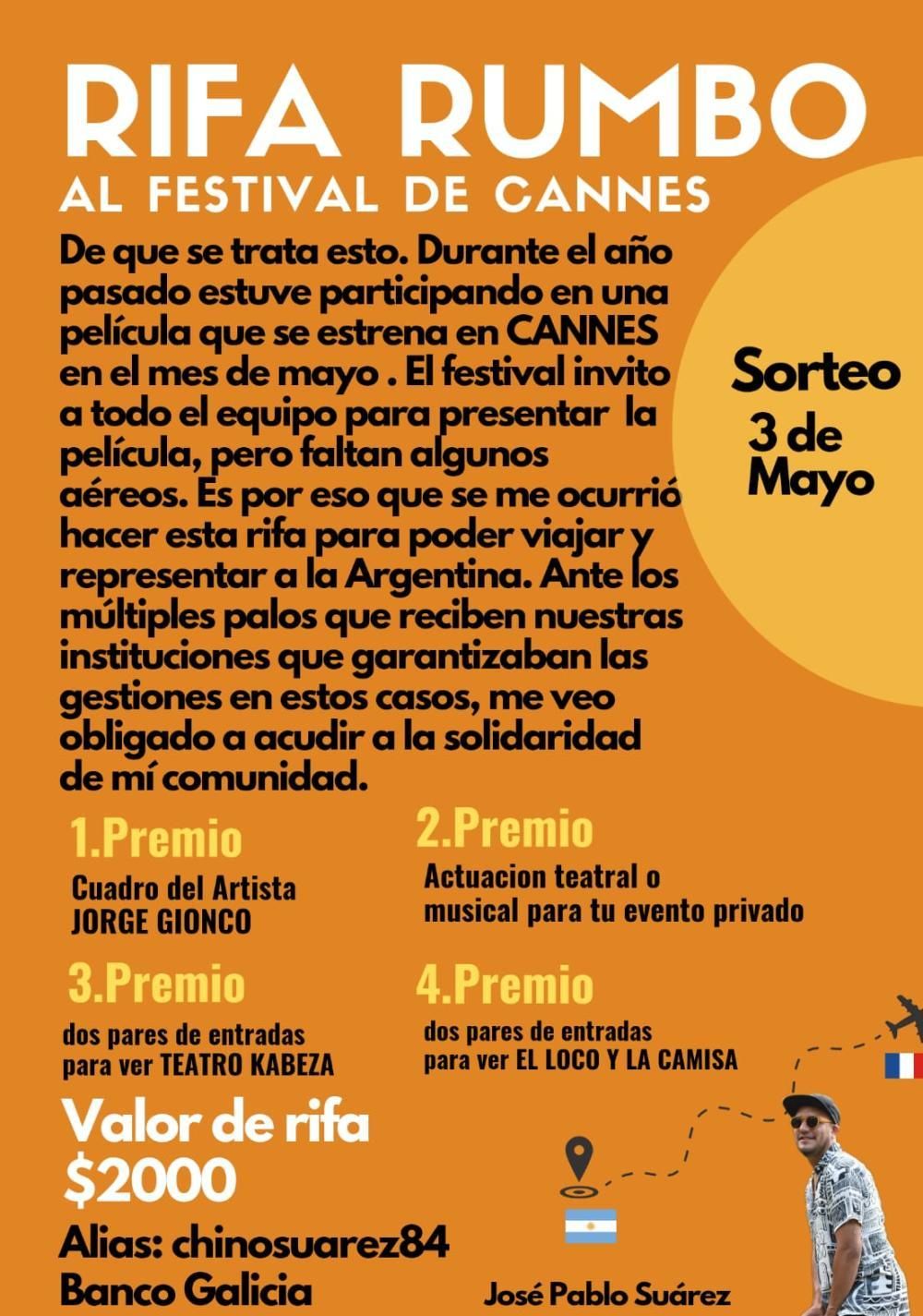 El actor y músico lomense lanzó una rifa, con importantes premios, para terminar de juntar el dinero para el pasaje y poder estar presente en el estreno del film en tierras galas.
