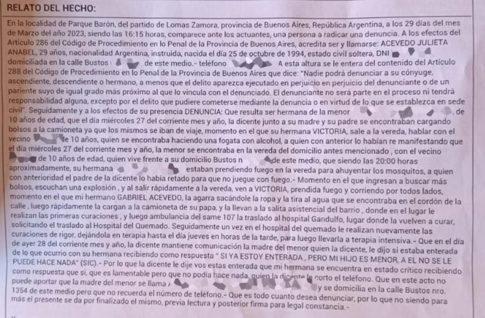 Según consta en la denuncia realizada en la Comisaría de Parque Barón, la víctima, de nombre Victoria, se preparaba para viajar junto a sus padres y hermanos a la Costa, cuando otro nene del barrio la invitó a hacer "una fogata" para espantar a los mosquitos, en frente de su casa, sobre la calle Bustos al 1300.