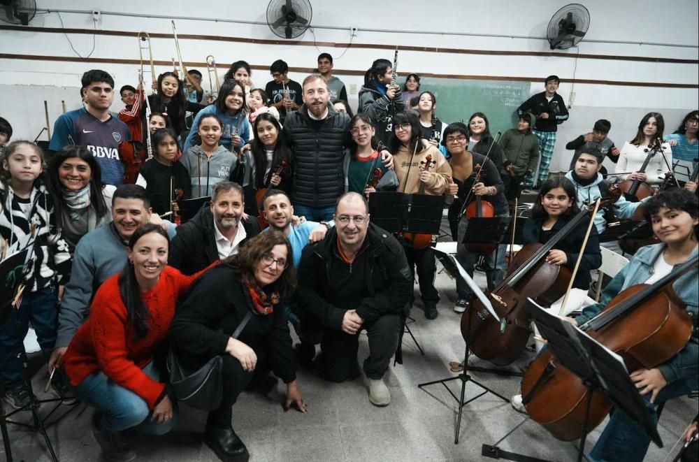 "Disfrutamos de un ensayo de la Orquesta Plato Volador, que funciona en la Escuela N°18 de Albertina y forma parte del programa de Coros y Orquestas de la provincia de Buenos Aires. Compartimos el encuentro con sus directores y autoridades de la Fundación Banco Provincia, que entregaron instrumentos para potenciar esta propuesta cultural e inclusiva", señaló el intendente Federico Otermín.