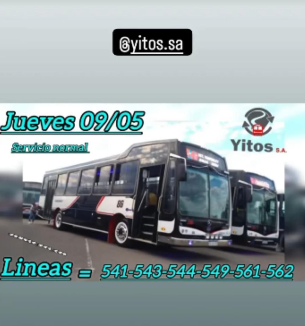 Además, en lo que respecta exclusivamente a Lomas de Zamora, la empresa Yitos anunció en sus redes sociales que prestará servicio normal, por lo que estará garantizado para sus usuarios el recorrido en sus líneas 541, 543, 544, 549, 561, y 562 durante toda la jornada.