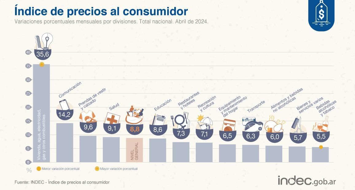 La división de mayor aumento en el mes fue Vivienda, agua, electricidad, gas y otros combustibles (35,6%) por los incrementos en las tarifas de gas, agua y electricidad. Le siguieron Comunicación (14,2%), por las subas en servicios de telefonía e internet, y Prendas de vestir y calzado (9,6%) por cambios de temporada.