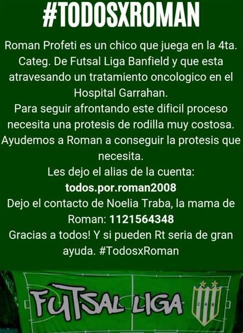 La campaña "Todos X Román" que inició el grupo de futsal del Club Banfield ya está activa para colaborar con uno de sus socios y jugadores a quien le diagnosticaron un tumor en la rodilla y necesita una prótesis muy costosa que debe estar antes de la intervención a la que debe someterse.