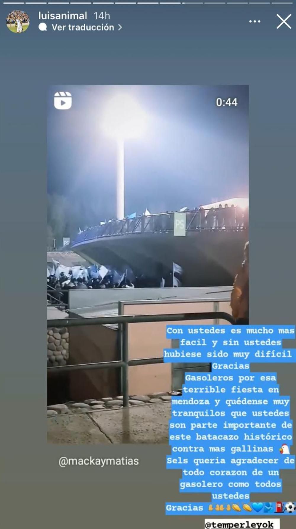 "Con ustedes es mucho más fácil y sin ustedes (los hinchas) hubiese sido muy difícil", arrancó Luis López el texto que escribió en una historia de Instagram.