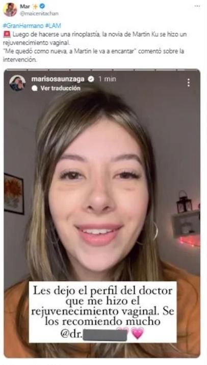 "Les dejo el perfil del doctor que me hizo el rejuvenecimiento vaginal. Se los recomiendo mucho", difundió en sus redes.