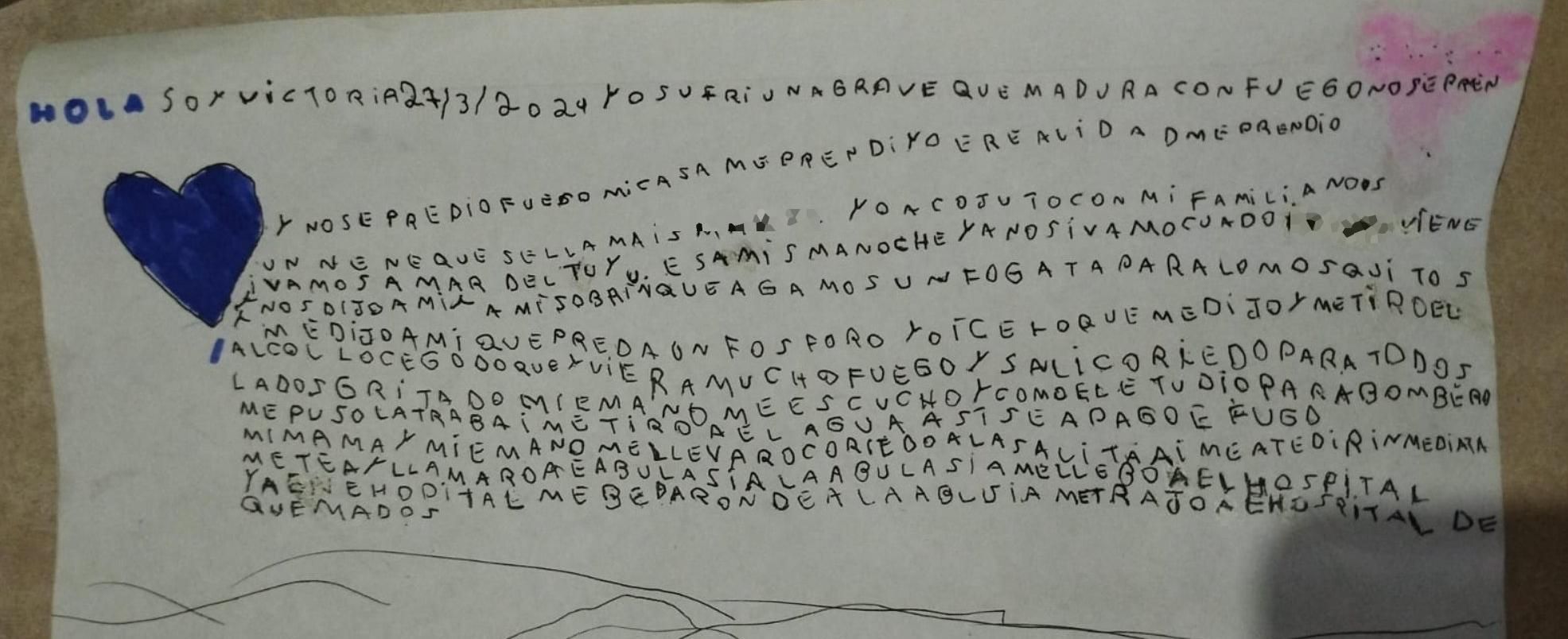 "Me dijo que hagamos una fogata para los mosquitos, me dijo que prenda un fósforo. Yo hice lo que me dijo, y me tiró el alcohol", recordó Victoria en el escrito, al que accedió este medio días atrás. Lo segundo que vi era mucho fuego, y salí corriendo para todos lados, gritando", siguió en otra parte del texto.