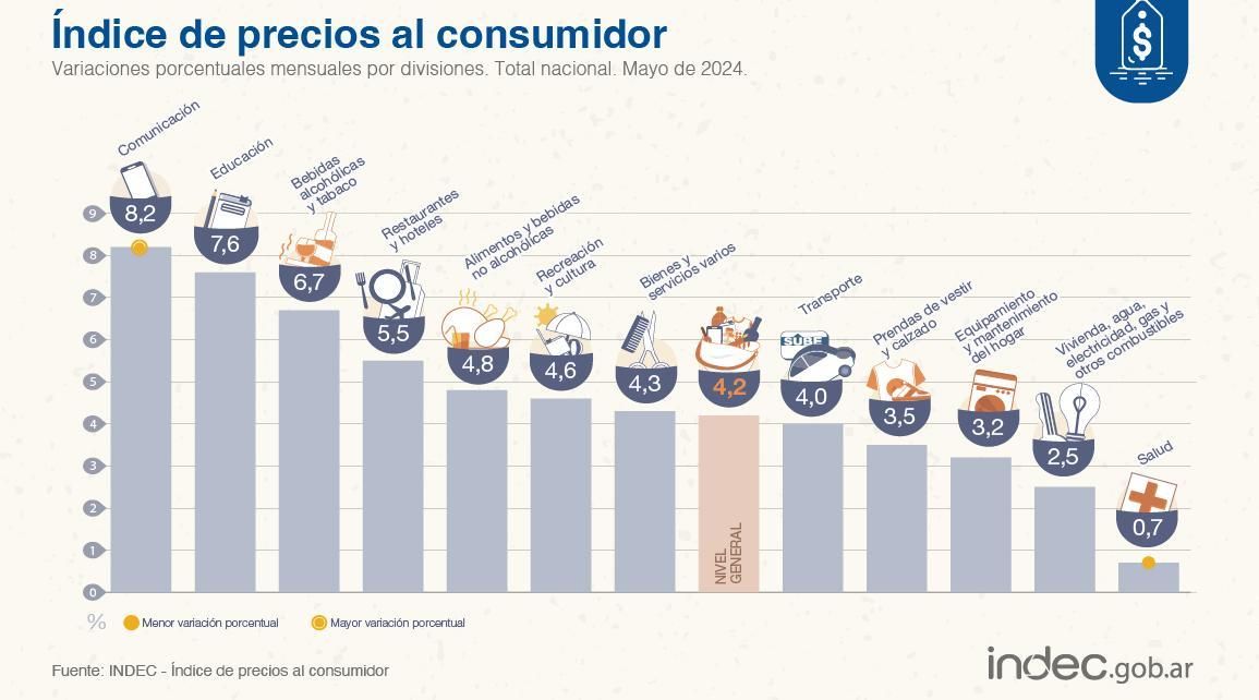 Las dos divisiones que registraron las menores variaciones en mayo fueron Salud (0,7%), por bajas en las cuotas de medicina prepaga, y Vivienda, agua, electricidad y otros combustibles (2,5%).