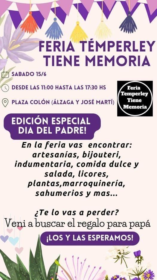 Una nueva feria de emprendedores llega de la mano del colectivo Temperley Tiene Memoria, pero en este caso el evento social y cultural estará enmarcado en el Día del Padre. La jornada se realizará el próximo sábado 15 de junio, a partir de las 11 en la Plaza Colón, donde los lomenses podrán disfrutar de diversos stands de artesanos como así también fomentar las relaciones personales y humanas entre los propios vecinos del barrio.
