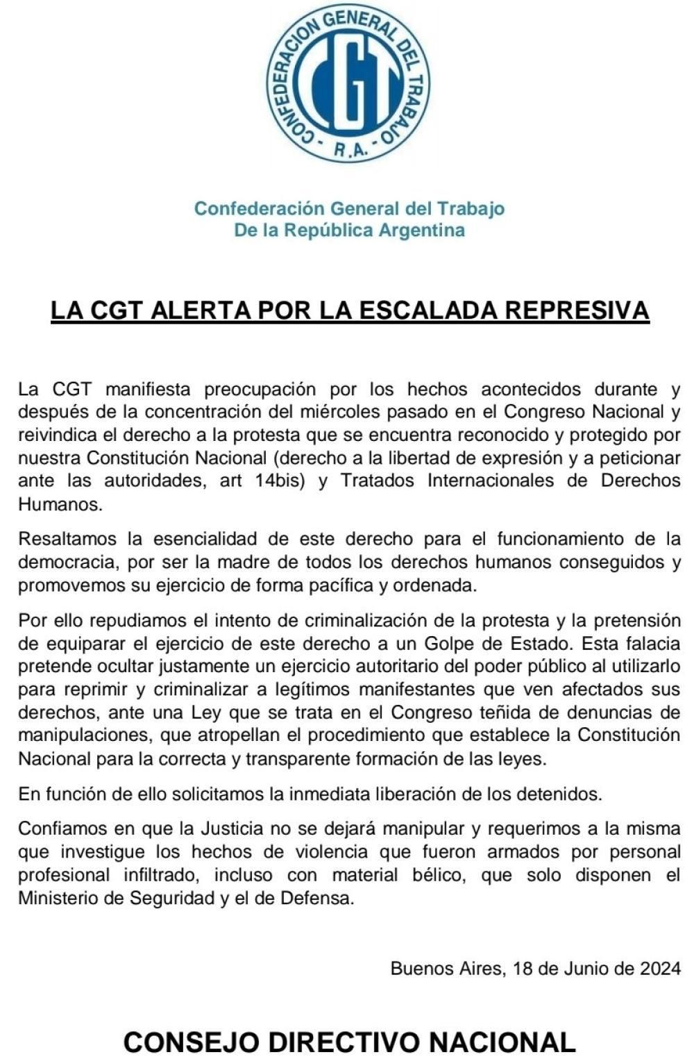 "La CGT manifiesta preocupación por los hechos acontecidos durante y después de la concentración del miércoles pasado en el Congreso Nacional y reivindica el derecho a la protesta que se encuentra reconocido y protegido por nuestra Constitución Nacional y Tratados Internacionales de Derechos Humanos", expresó la central sindical en un comunicado. En ese sentido, destacaron "la esencialidad de este derecho para el funcionamiento de la democracia" y repudiaron la "criminalización" de las medidas de fuerza.