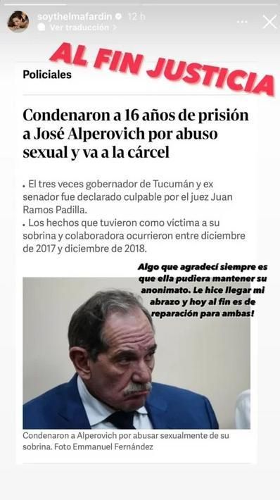 "Algo que agradecí siempre es que ella pudiera mantener su anonimato", expresó junto a la captura de la noticia que confirmaba el fallo. "¡Le hice llegar mi abrazo y hoy al fin es de reparación para ambas!", celebró la actriz.