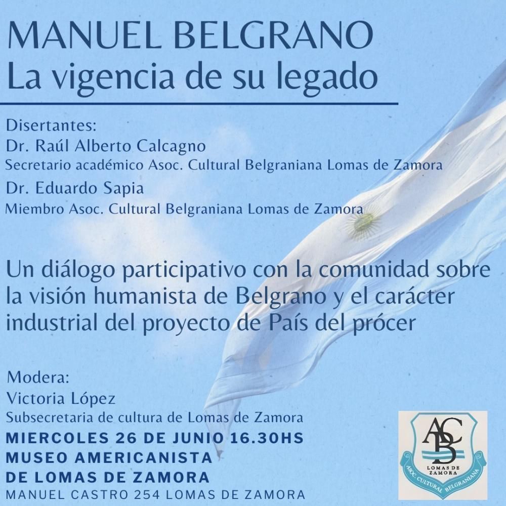 En el marco del Día de la Bandera, la Asociación Cultural Belgraniana de Lomas llevará a cabo un encuentro llamado "Manuel Belgrano, la vigencia de su legado", en un diálogo participativo con la comunidad lomense en el que se tratarán temas inéditos de la vida del creador de la bandera. La jornada será este miércoles 26 de junio, a partir de las 16.30, en el Museo Americanista de Lomas (Manuel Castro 254), con entrada libre y gratuita.