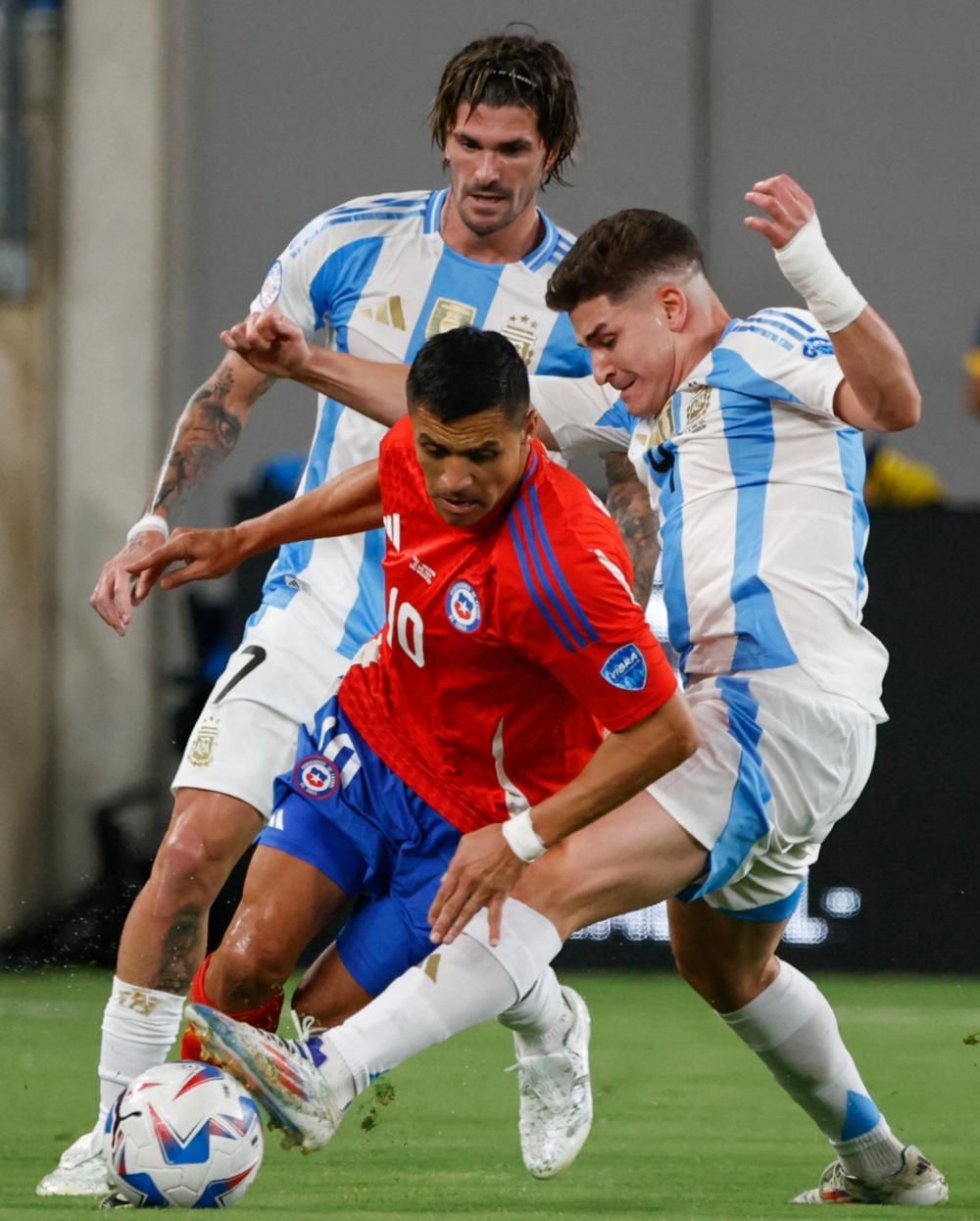El inicio del complemento mostró la misma foto que el primero: Argentina en vocación ofensiva y Chile, replegado, a la espera de alguna contra. Y ese ímpetu lo tradujo en situaciones de peligro. Por eso, en los primeros 15 minutos, generó dos, ambas tapadas por Bravo. En la primera, a los 4, respondió bien ante un fuerte remate de Nahuel Molina, y la segunda, a los 15, hizo lo mismo ante un fuertísimo remate de Nico González que después se estrelló en el palo.