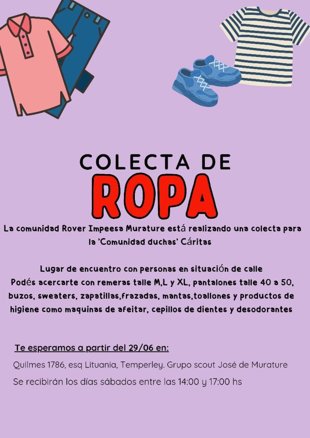 El Grupo Scout José Murature de Temperley lanzó, a través de su comunidad Rover (rama comprendida por jóvenes de 18 a 23 años), una colecta de ropa y elementos de higiene personal que serán destinados a la Comunidad Duchas de Cáritas Lomas, situado en Rivera 279.