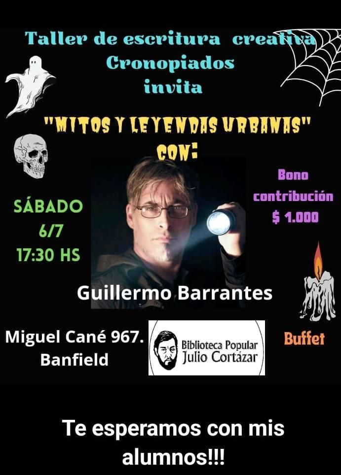 Guillermo Barrantes, escritor reconocido por sus trabajos sobre leyendas urbanas estará este sábado a las 17.30 en la Biblioteca Popular Julio Cortázar, invitado por los alumnos del taller de escritura creativa,  "Cronopiados" .