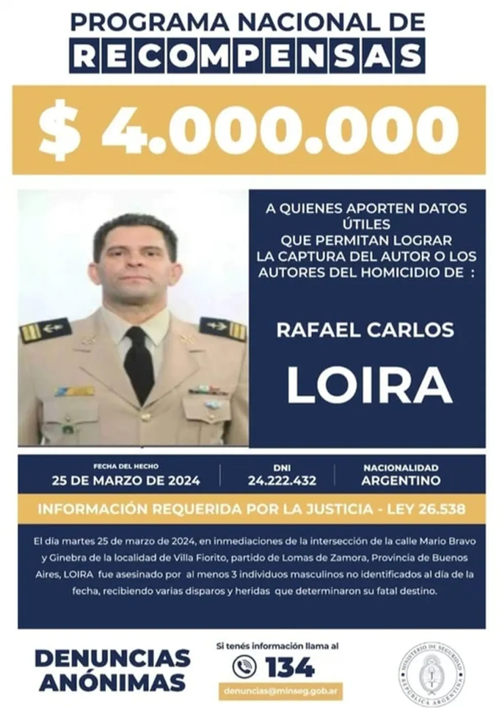"Ofrécese como recompensa, dentro del territorio de la REPÚBLICA ARGENTINA, la suma de PESOS CUATRO MILLONES ($4.000.000), destinada a aquellas personas que, sin haber intervenido en los hechos delictuales, brinden datos útiles que permitan lograr la detención del autor o los autores del homicidio de Rafael Carlos LOIRA", expresa la Resolución 628/2024 publicada en el Boletín Oficial y firmada por Patricia Bullrich.