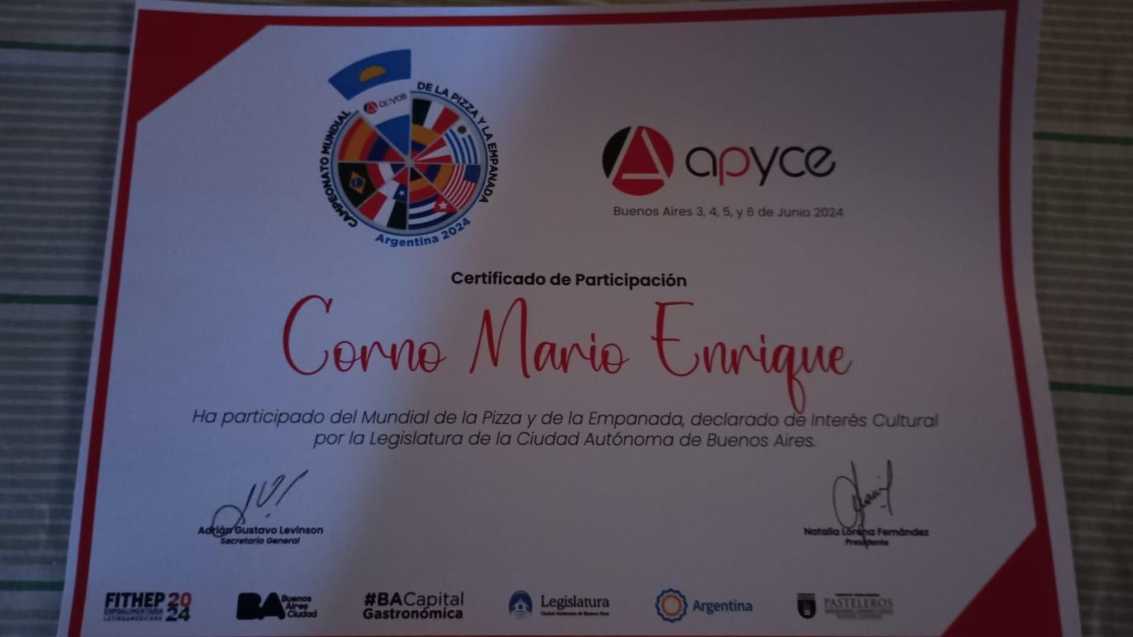 Una vez finalizada la competencia, Corno recibió un certificado de participación por parte de la Asociación de Pizzerías y Casas de Empanadas de Argentina (APYCE), quien organizó el mundial junto al Sindicato de Pasteleros de Buenos Aires.