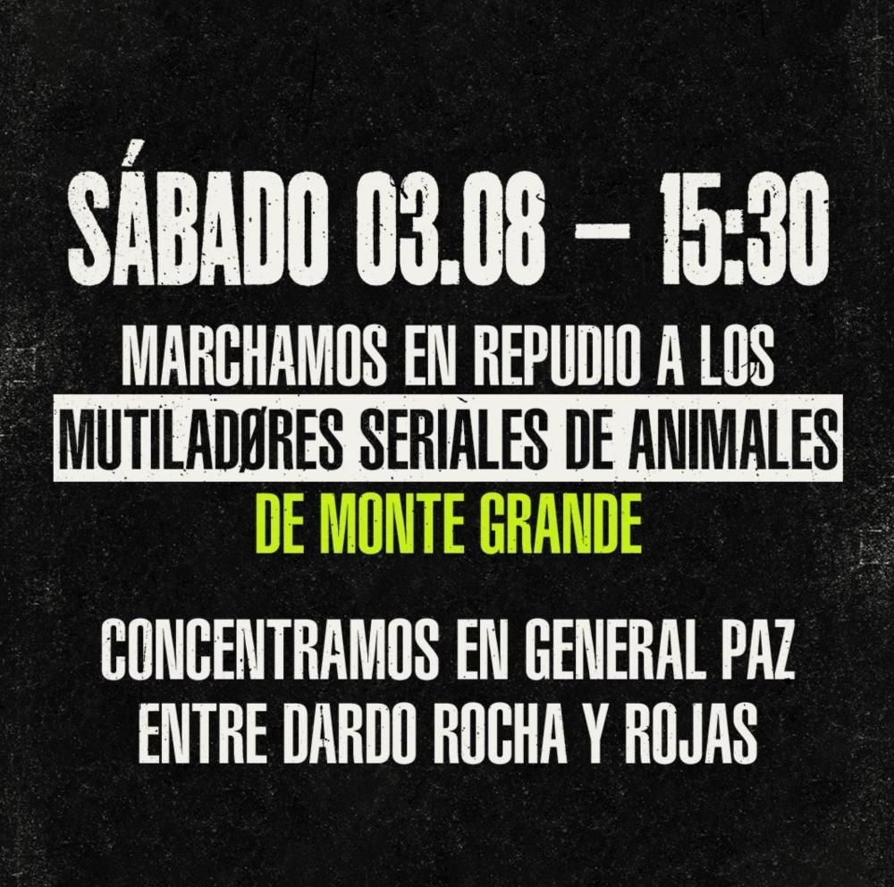 La manifestación será el próximo sábado a partir de las 15.30 sobre la calle General Paz, entre Dardo Rocha y Rojas, en Monte Grande, bajo la consigna de "los animales importan" y para pedir justicia por las diferentes víctimas de cuatro patas de "la familia de mutiladores".