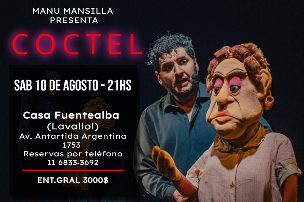 La Casa Cultural Carlos Fuentealba de Llavallol y el titiritero lomense Manuel Mansilla se unen para ofrecerle al público local y de zona Sur una noche de teatro. Este sábado presentarán "Cóctel", una obra que está pensada para jóvenes adolescentes (mayores de 13 años) y adultos. Las entradas anticipadas ya se encuentran a la venta.