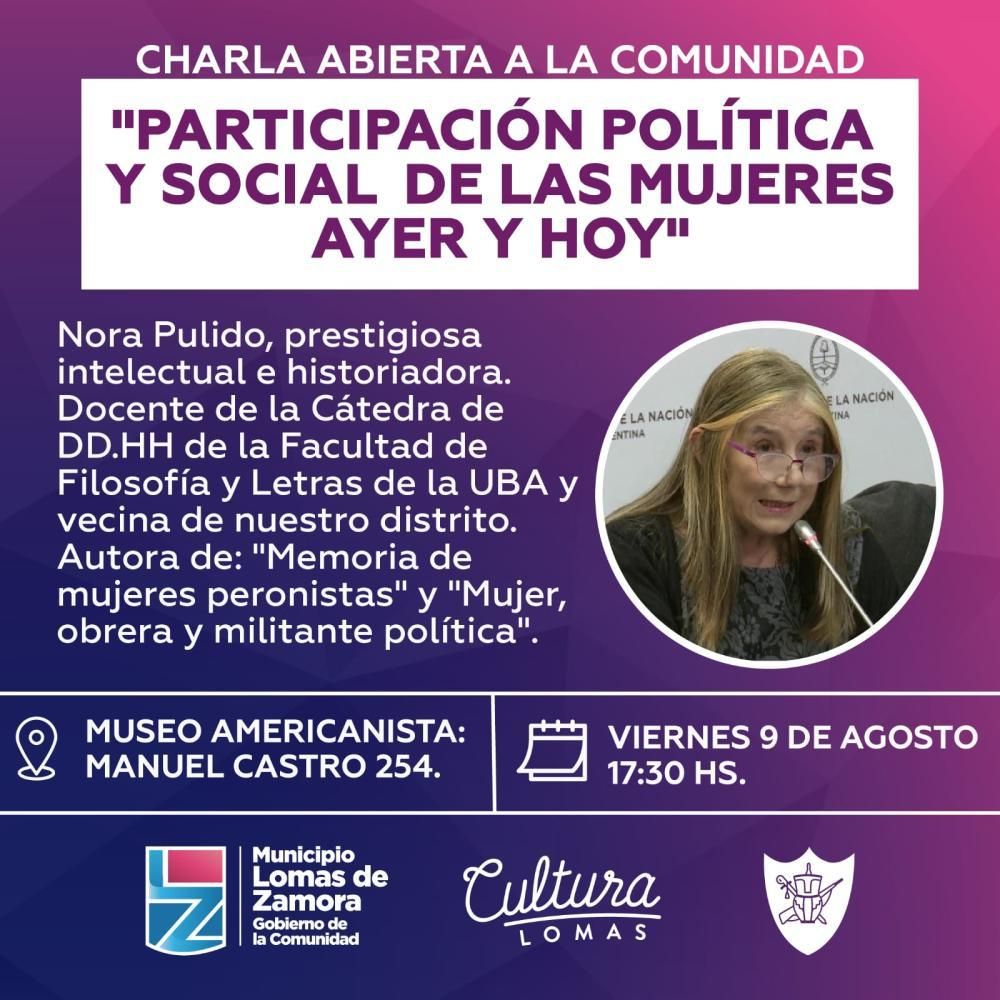 Lomas será protagonista de una nueva charla abierta a la comunidad titulada "Participación política y social de las mujeres, ayer y hoy". La jornada, con entrada libre, se llevará a cabo hoy a partir de las 17.30 en el Museo Americanista (Manuel Castro 254).