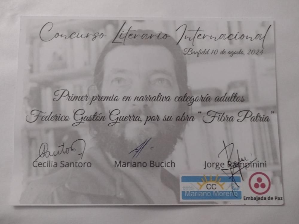 En la entrega de premiaciones a los ganadores del Concurso Literario Internacional "Tras las huellas de Cortázar", un evento organizado por el Centro Cultural Mariano Moreno de Banfield, el lomense Federico Guerra se quedó con el primer puesto en la Categoría Narrativa Adultos gracias a su cuento "Fibra Patria", un texto que imagina qué sintió Cortázar, de 9 años, durante la histórica pelea de Luis Ángel Firpo y Jack Dempsey.