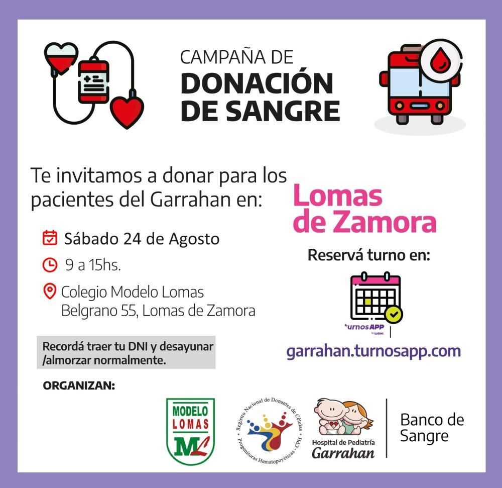 El Colegio Modelo Lomas será sede de una campaña de donación de sangre a beneficio del Hospital Garrahan. La jornada se realizará el próximo sábado 24 de agosto, de 9 a 15, donde los vecinos van a poder acercarse a donar sangre de manera voluntaria. Aún quedan algunos turnos disponibles.