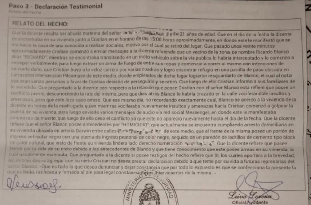La denuncia, a la que tuvo accedo La Unión, había sido radicada en la Comisaría de Villa Fiorito por una mujer que contó que su nieto había sido amenazado de muerte por Ricardo Blanco, uno de los imputados por homicidio.