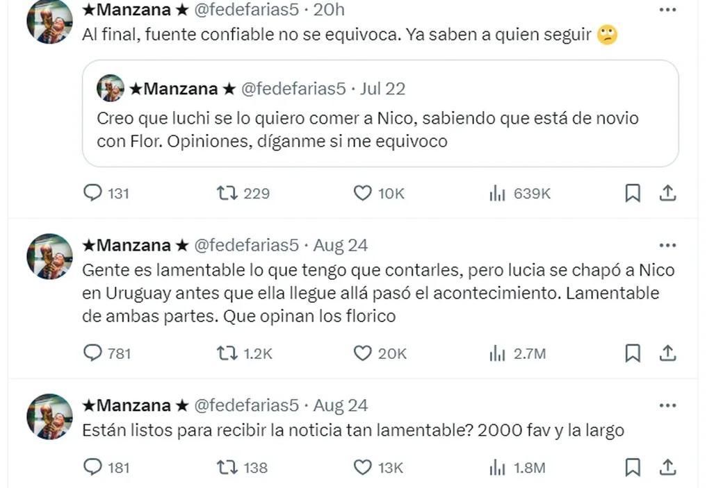 "Después de todo el bardo que se armó por la supuesta infidelidad de Nicolas a Flor Regidor con Lucia. Abro hilo con las pruebas q me mandaron el jueves donde confirman que en realidad Nico dejó a Florencia porque encontró chats de ella con Mauro", escribió la influencer.