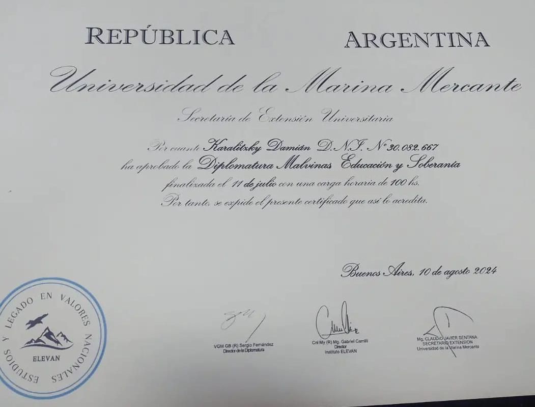 Damián Karalitzky, el creador del proyecto lomense "Malvinas en tu Barrio" recibió la diplomatura sobre Malvinas, Educación y Soberanía que brinda el instituto Elevan (Estudios y Legado en Valores Nacionales) con la Universidad de la Marina Mercante.
