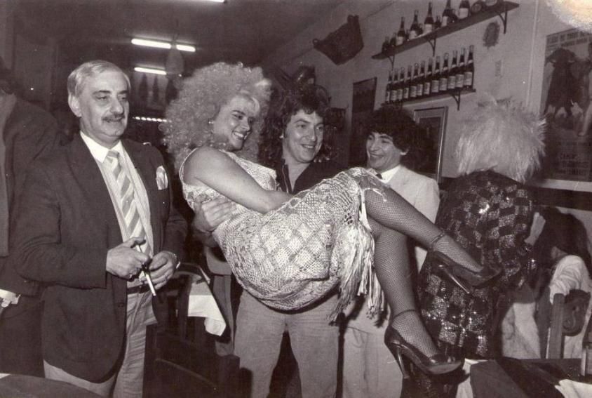 En la imagen se lo puede ver al legendario rockero levantando a Upa a la intérprete de "La Güera Salomé" en el restorán Fechoría, un local clásico de la noche porteña.