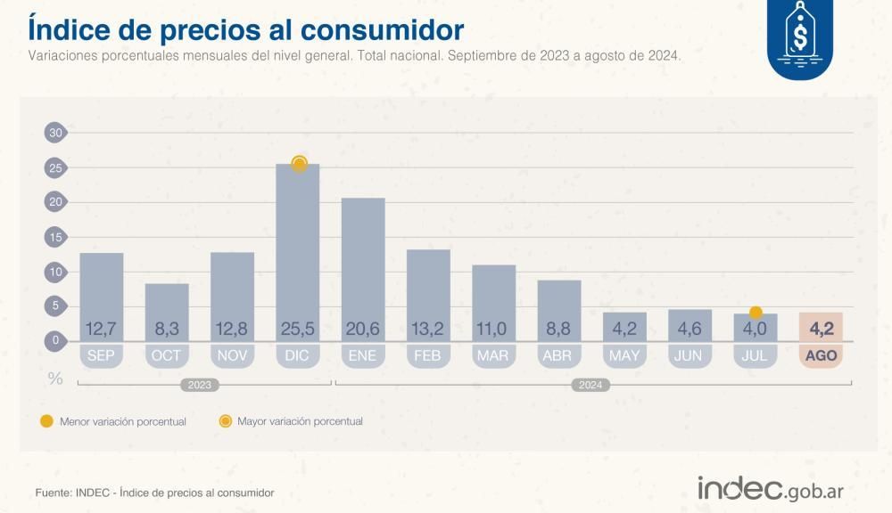 Las principales consultoras privadas habían adelantado que el índice sería muy similar al 4 % de julio: esperaban un dato de entre un 3,8 % y un 4,2 %. Con estos números, y pese al aumento inesperado,, se consolida una racha de cuatro meses consecutivos con un avance en el nivel de precios similar, estancado en torno al 4 %.