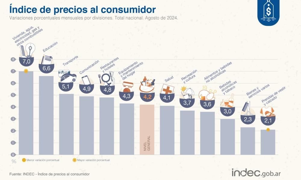 El rubro de mayor aumento en el mes fue Vivienda, agua, electricidad y otros combustibles con el 7% por las subas en los alquileres de las viviendas y gastos conexos, como suministro de agua y electricidad, gas y otros combustibles. Le siguieron Educación, con el 6,6%; por el alza en los distintos niveles y tipos de enseñanza; y Transporte, 5,1%; por los incrementos en el transporte público.
